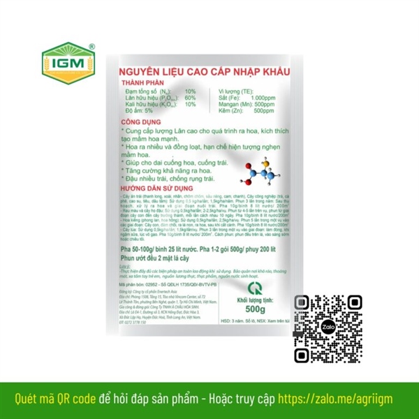 Phun lá: Pha 500g/200L nước, phun ướt đều cả hai mặt lá trước khi ra hoa 10–15 ngày, lặp lại 2–3 lần để hoa ra đều, đậu mạnh.